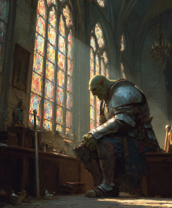 穆格朱被一陣一陣輕柔的鳥鳴聲叫醒,他發現自己躺在乾淨溫暖的床上,花香透過窗戶飄蕩進來,那幾隻叫醒他的頑皮小鳥就在窗外的樹枝上蹦蹦跳跳。他所在的房間簡樸卻整潔,床頭櫃上擺放着清水和新鮮水果。穆格朱突然意識到自己竟想不起來有多久沒見過新鮮的水果、聞到芬芳的花香、聆聽鳥雀的啾鳴,死靈法師的腐敗巢穴竟然在不知不覺中影響他那麼深。房間的小木門打開,那個黑髮帝國人走了進來,他自我介紹叫奧塔維,是九聖靈修會的大團長。奧塔維問穆格朱家在哪裏,還有沒有家人朋友,等他養好了就送他回去。穆格朱沉默良久,磕磕巴巴地說:「我曾經的朋友都死在了那個地城,我也不想回部落,我就是從那個家裏跑出來的。大團長,我知道這個要求或許有些過分,但是,我能不能留在這裏?我願意做牛做馬!只要……只要我能贖清我的罪孽。」奧塔維沉默地凝視了他一會,穆格朱以爲自己這樣犯了大錯的人一定會被拒絕,不料奧塔維對他說:「我們不需要你做牛做馬,但聖靈歡迎所有人。」穆格朱再一次流下淚水。就這樣,穆格朱成爲了見習騎士,由大團長奧塔維本人教導。